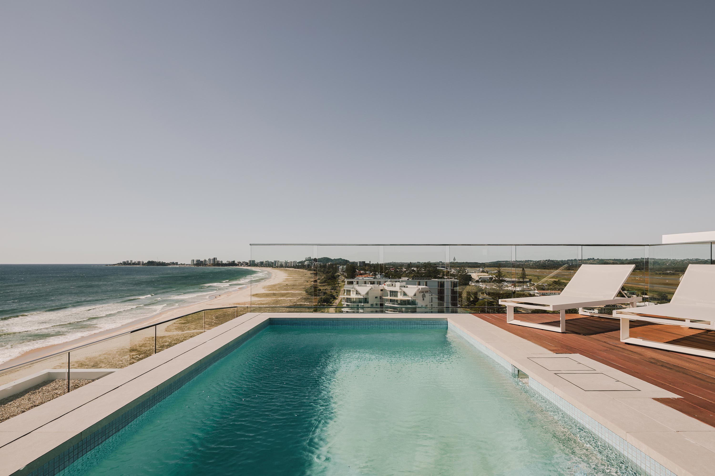 The tower’s massing is articulated into two offset volumes that appear to float in opposition, creating a dynamic yet balanced composition. This approach minimises the building’s visual and physical footprint, with structural elements and material selections reinforcing a light, elevated presence. A coastal material palette of vertical and horizontal timber-look louvres combined with rendered finishes that reference the adjacent sand provides a refined, timeless aesthetic for this boutique residential project.