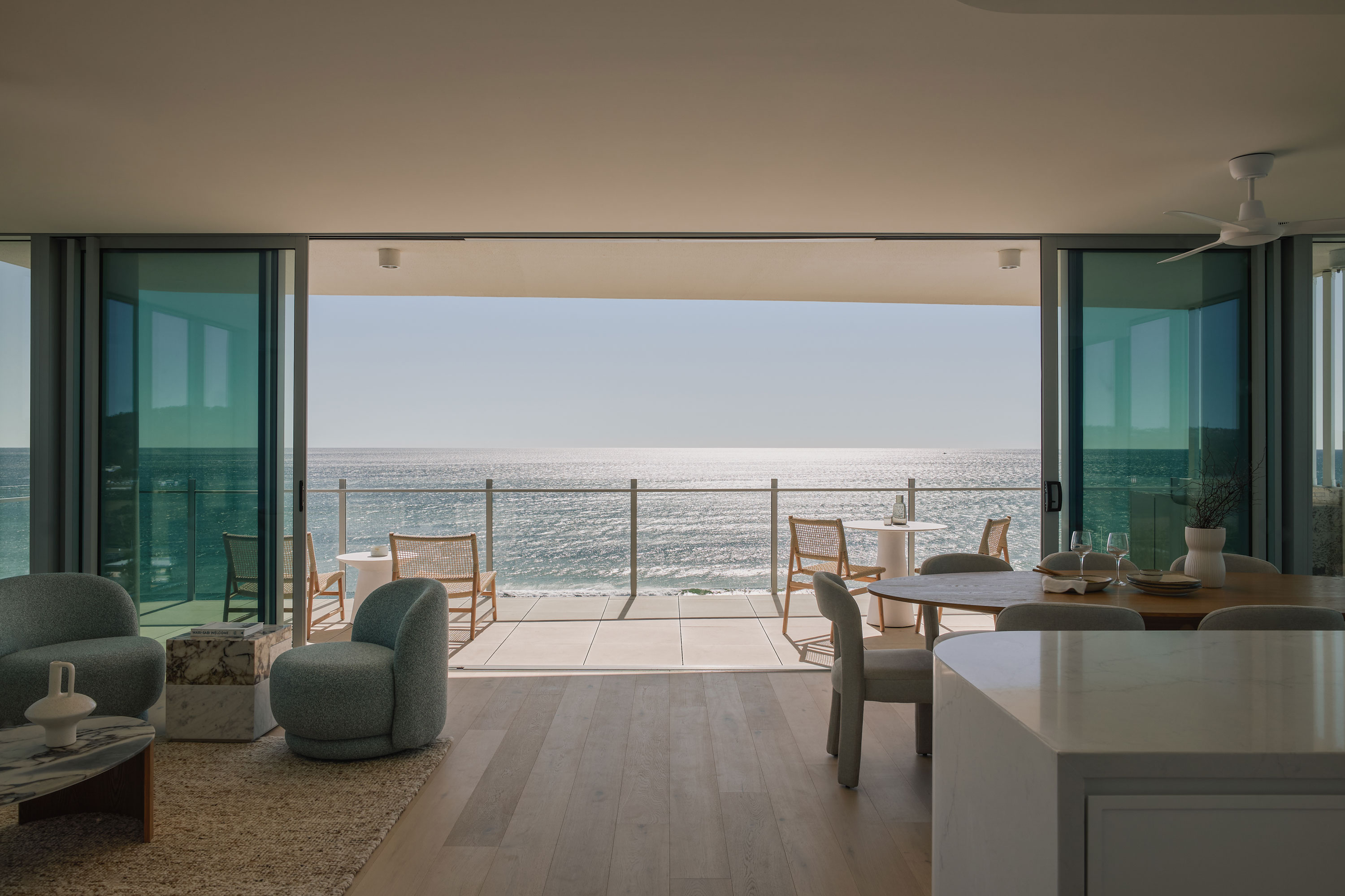 Interior spaces prioritise seamless indoor-outdoor connectivity with floor-to-ceiling glazing, durable coastal-grade finishes, and a restrained material palette of oak, limestone, and matt metals. Custom joinery and curated furnishings enhance functionality without compromising the architecture’s clean lines, delivering a sophisticated, low-maintenance beachfront lifestyle.