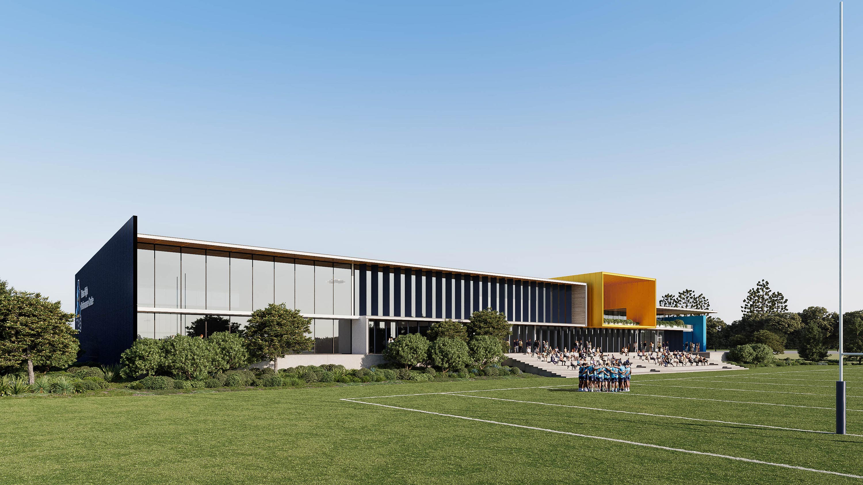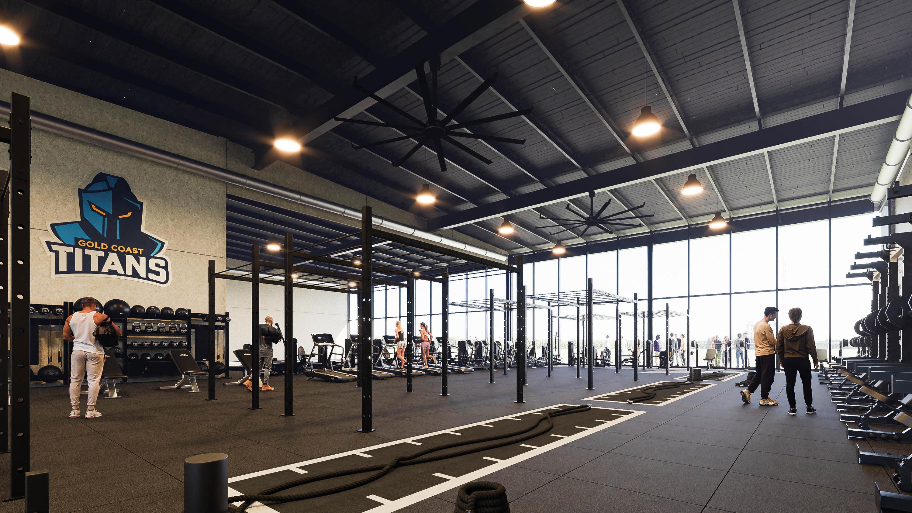 The dedicated Titans building houses a cutting-edge gymnasium, advanced recovery zones, locker rooms, exclusive player dining, offices, and an inviting public café, while shared public spaces encompass full-sized fields, an indoor netball court, and extended operating hours from early morning to 10pm, all designed with sustainable flood mitigation in mind.